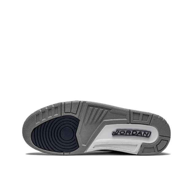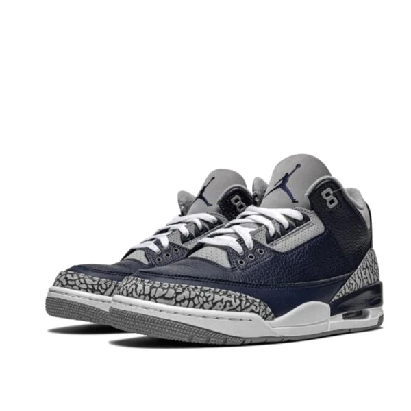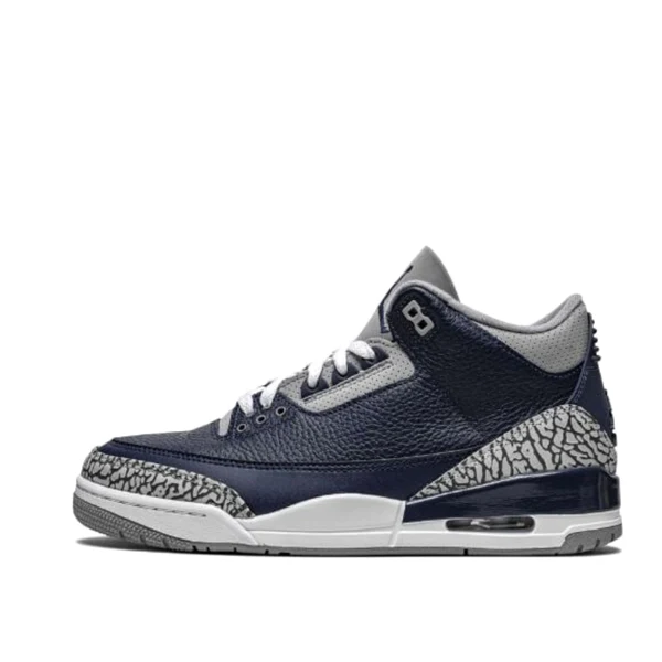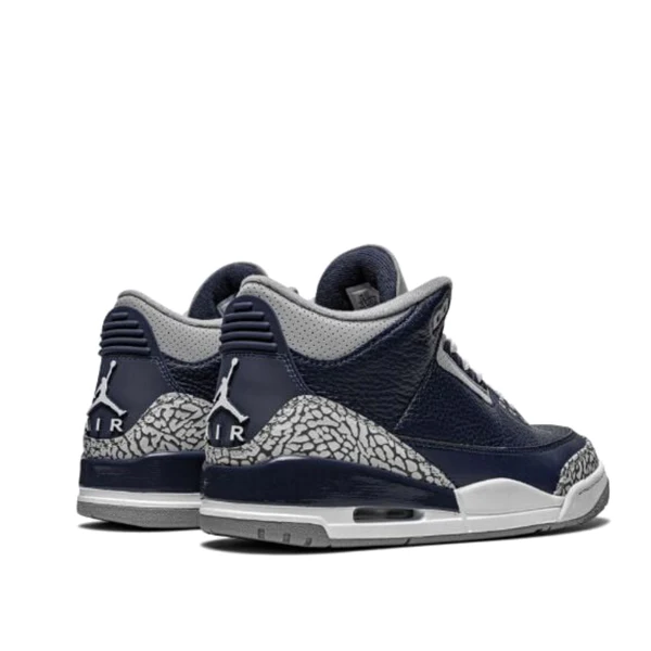 The Air Jordan 3 “Georgetown” is a March 2021 release of Michael Jordan’s third signature shoe in a Georgetown Hoyas inspired colorway. Unofficially, the “Georgetown” honors the college basketball powerhouse by employing the team’s uniform colors in its design. The look references many of the Player Exclusive “Georgetown” colorways given to members of the Hoya family by Jordan Brand. Details include a Midnight Navy tumbled leather upper with contrasting dotted Cement Grey leather panels on the eyelets, collar, and tongue. Classic elephant print appears on the heel and toe as per the original styling of the Air Jordan 3. Additional design cues include a navy blue embroidered Jumpman on the grey leather tongue, white laces, and a white Jumpman on the heel. A visible Air unit in the heel of the white midsole completes the look of this “Georgetown” edition of the Jordan 3.