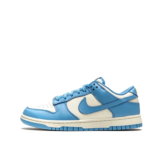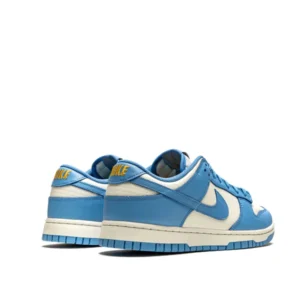 The Women’s Nike Dunk Low “Coast” is the women’s sizing of the enduring low-top silhouette that was released by Nike in January 2021. Seemingly inspired by the UCLA Bruins, the “Coast” colorway proudly displays the Los Angeles institution of higher education’s light blue and gold color scheme in its design. Coast (or light blue) leather overlays can be found on the forefoot, eyelets, collar, and heel. The same airy hue of blue is located on the Swoosh branding on the mid-panel, on the leather heel tab with gold “Nike” embroidery, liner, and shoe laces. University Gold accenting can be found on the “Nike Air” branded nylon tongue tag. Finishing touches include a white mesh tongue and white rubber midsole and Coast outsole.