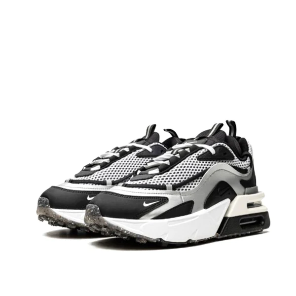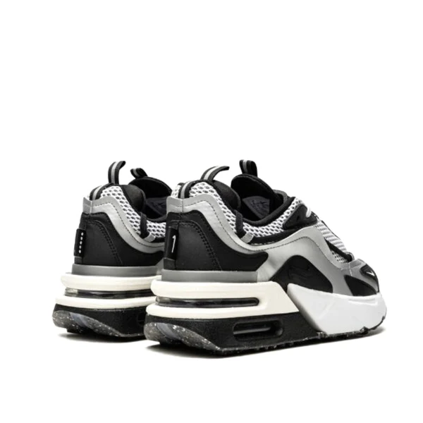 The Women’s Nike Air Max Furyosa “Silver/Black” is a futuristic lifestyle shoe for women that continues the lineage of Nike’s Air Max collection. Hardly subtle, the Air Max Furyosa’s design is an amalgamation of various Nike Air Max styles, including the Air Max, 1 Air Max 95, Air Max 270, and more. The model’s wavy mudguards are inspired by the Air Max 98. An extra lacing system wraps from the toe to around the collar and pairs with a traditional lacing setup. The white mesh detailing on the upper exaggerates the look of the mesh detailing found on the Air Max 95. Underfoot, Nike adds double-stack Air units that are surrounded by individual EVA foam panels. The structure is disconnected from the forefoot, thus creating an elevated, raised effect toward the back of the shoe à la the Air Max 93 and Air Max 270.
