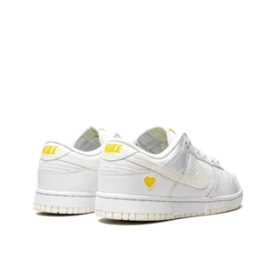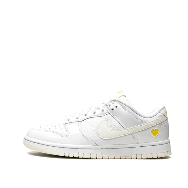 The Women’s Nike Dunk Low “Yellow Heart” is a women’s-exclusive colorway of the retro basketball shoe that celebrates Valentine’s Day 2023. Dressed in a mostly monochromatic white colorway, the “Yellow Heart” has a tumbled white leather base with smooth tonal leather overlays. A Sail leather Swoosh is found on either side of the shoe. Yellow “Nike” branding is embroidered on the heel and classic “Nike” and Swoosh detailing appears on the tongue tag. A yellow heart emblem is found on the lateral side of the shoe.
