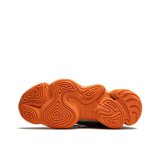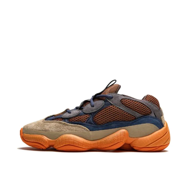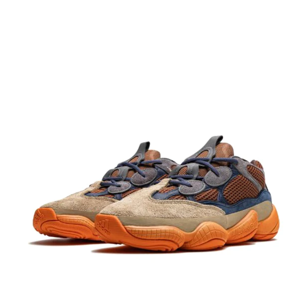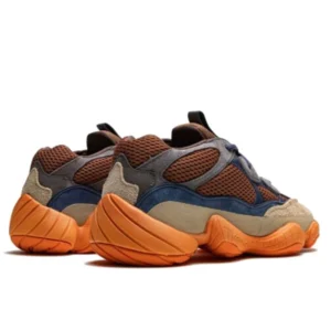 The adidas Yeezy 500 “Enflame” is a vibrant makeup of the chunky, sneaker by Kanye West. Released in April 2021, the “Enflame” is one of the more abstract colorways in the Yeezy 500 collection. Its mixture of bright and earthy colors is a departure from the neutral based looks that dominated early Yeezy 500 releases. Faded navy blue suede panels appear over the brown mesh base on the eyelets and on the collar and heel. Royal blue leather overlays can be found on the forefoot and sandy suede detailing on the toe. A beige mudguard allows for the bright orange Feet You Wear midsole to attract serious attention.