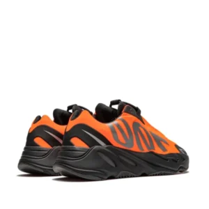The adidas Yeezy Boost 700 MNVN “Orange” is a vivid colorway of Kanye West’s heralded “dad shoe” with adidas. The model’s first form of outward branding is seen on the mid-panel as reflective “700” detailing is printed in a silver font and shines when exposed to light. Futuristic black and grey accenting can be found on the heel and toe, giving the shoe an evolutionary look when compared to prior releases. A black throat and midsole, which houses adidas’s comfortable Boost cushioning technology, allow for the bold orange upper to attract attention everywhere it goes.